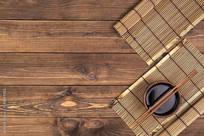 Background for sushi. Bamboo mat, soy sauce, chopsticks on wooden table. Top view with copy space