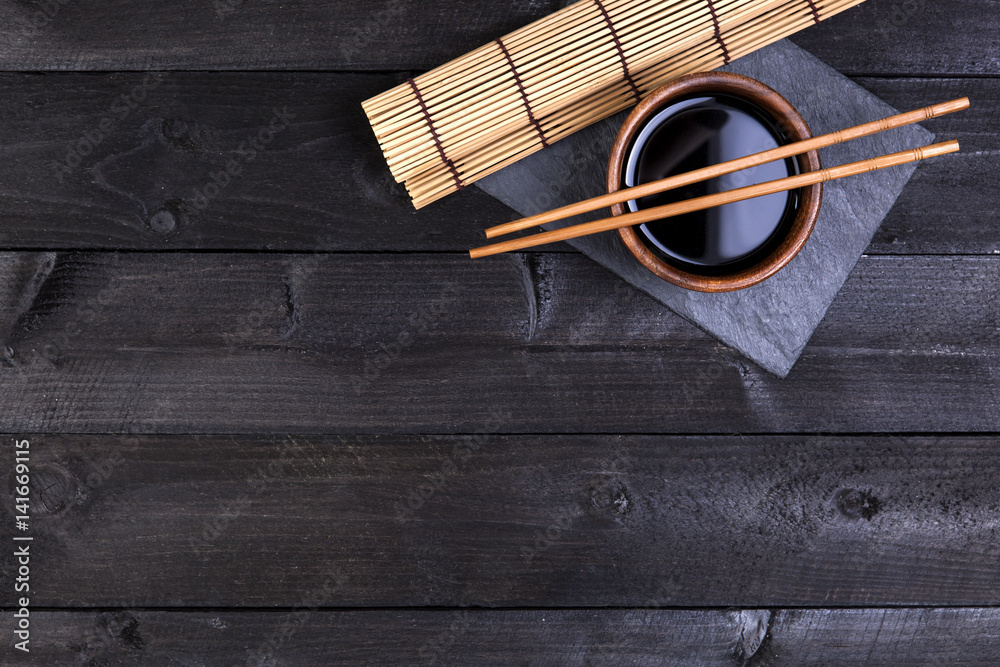 Background for sushi. Bamboo mat, soy sauce, chopsticks on dark table. Top view with copy space