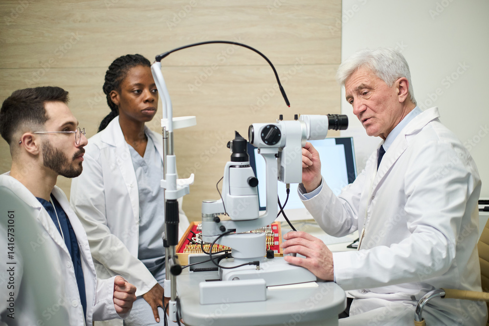 Senior doctor demonstrating usage of medical examination equipment to caucasian male and black female doctors during training session in modern clinic