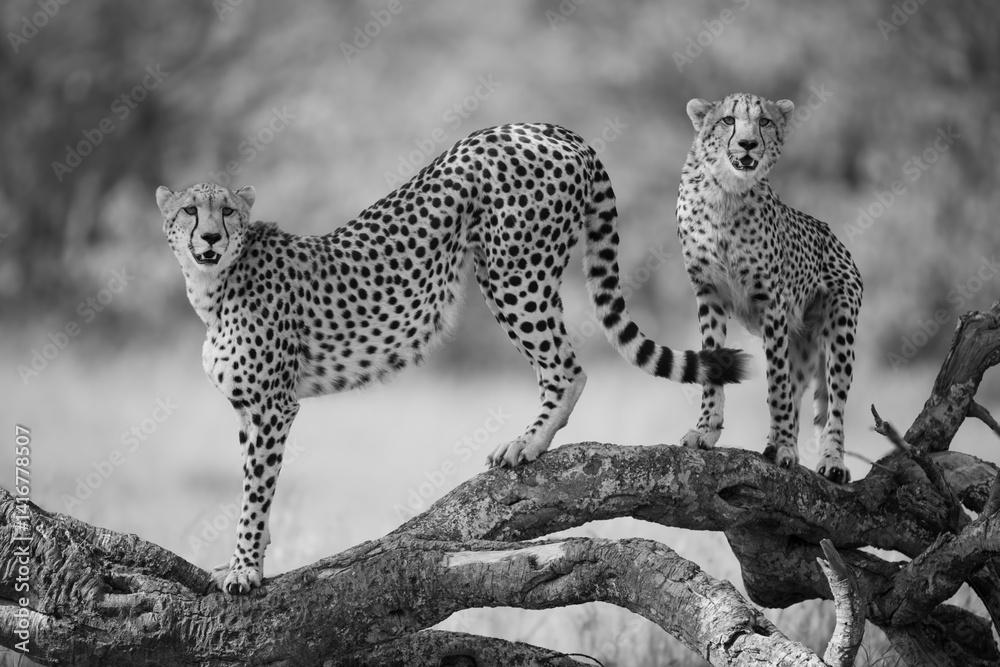 Mono cheetah and cub stand on log