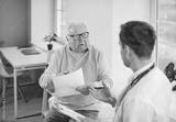 Senior retired gray-haired man talking to a male doctor in his office in clinic during medical examination. Male physician listening to elderly patient's complaints. Healthcare and medicine concept.