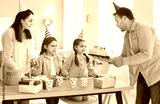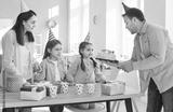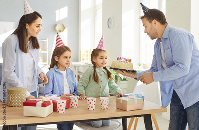 Happy family birthday party with cake, parents and children wearing funny party hats, congratulate, present cake and gift, excited kids laughing and have fun greeting at home, making surprise