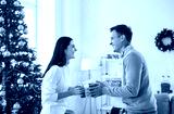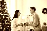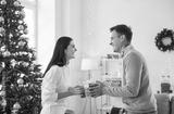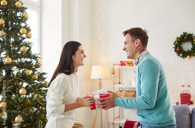 Happy couple exchanges gifts at home during the New Year or Christmas celebration. Love and surprise bring joy and pleasure as they share the holiday spirit in a festive family setting.
