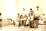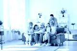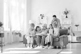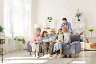 Multi generational extended family reading story together. Grandfather, grandmother, mom, dad and children sitting on sofa in light living room interior in grandparents' apartment and reading book