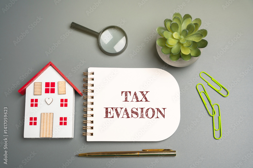 Tax evasion concept. Illegal act of deliberately avoiding paying taxes by hiding income, inflating deductions, or using other dishonest methods to reduce tax liability. Notepad with inscription, house