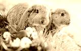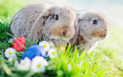Colorful Easter eggs and bunny in the grass
