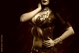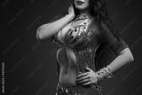 Exotic eastern women performs belly dance in ethnic red dress