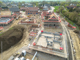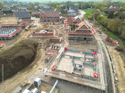 Low level aerial view of partially completed new homes on a housing development site in rural Britain. Both private and affordable homes will be for sale in this village.
