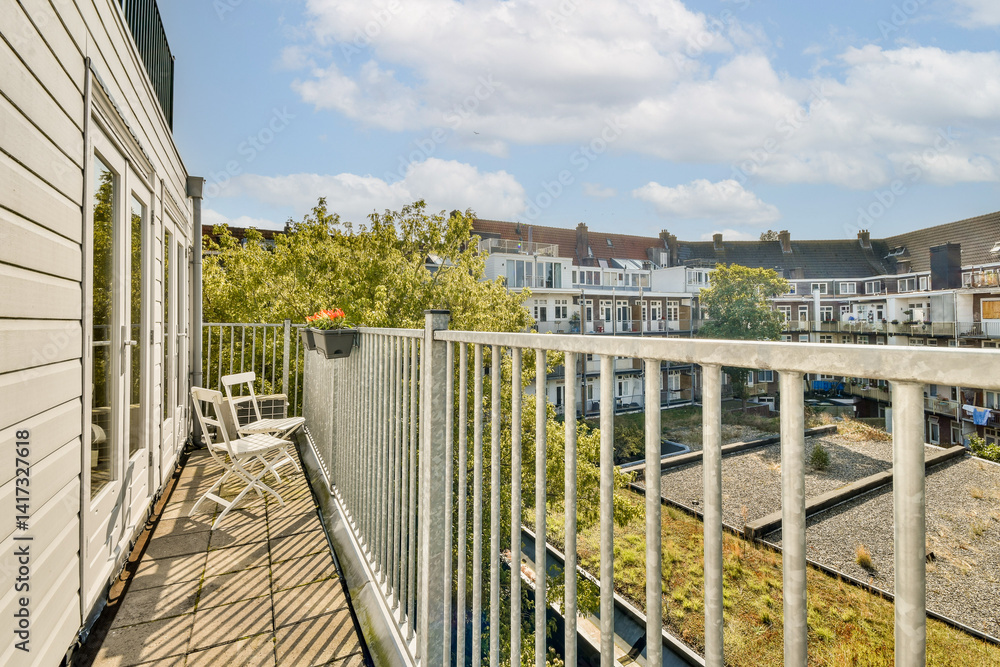A stylish balcony view featuring contemporary architecture blending with greenery, capturing the essence of urban living in a vibrant neighborhood.