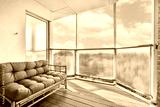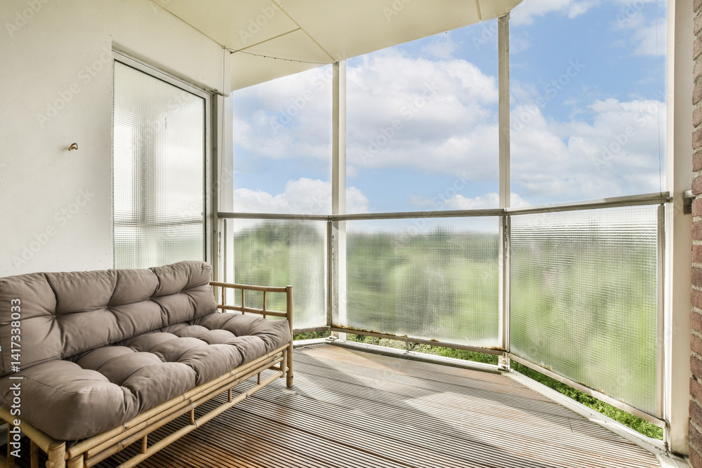 A serene balcony featuring comfortable seating and expansive views of greenery under a bright sky. Ideal space for relaxation and enjoying nature.