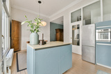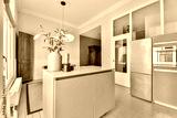 A stylish kitchen with modern design elements, featuring light colors, elegant furniture, and abundant natural light creating a welcoming atmosphere.