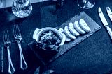 Portion of gourmet delicacy royal shrimp with toasted bread