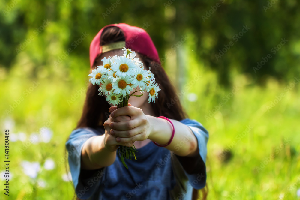 Girl with long hair in a cap holds out bouquet of chamomile, daisies to us, in front of face. Natural soft blurred background