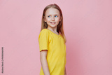 Smiling girl in a bright yellow shirt against a pastel pink background, showcasing youthful joy and playful innocence, ideal for children s fashion and lifestyle concepts