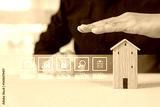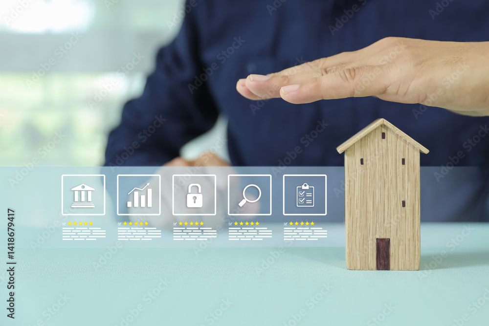 Hand choose house with financial planning icons for plan of money savings or for home loan management for buy housing residential or family insurance or banking agreement.