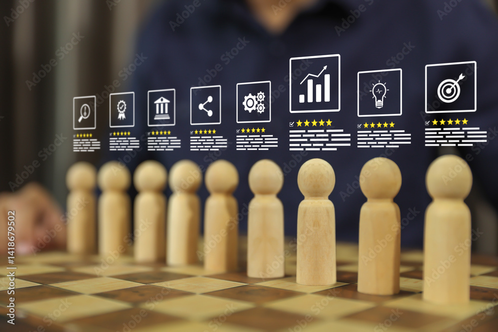 Person wooden doll with HR human resources icons for leader or group teamwork people officer or business planning relationship or team player and personnel management job performance.