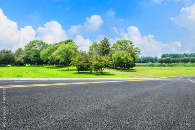 Asphalt road and green trees in the blue sky