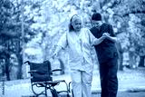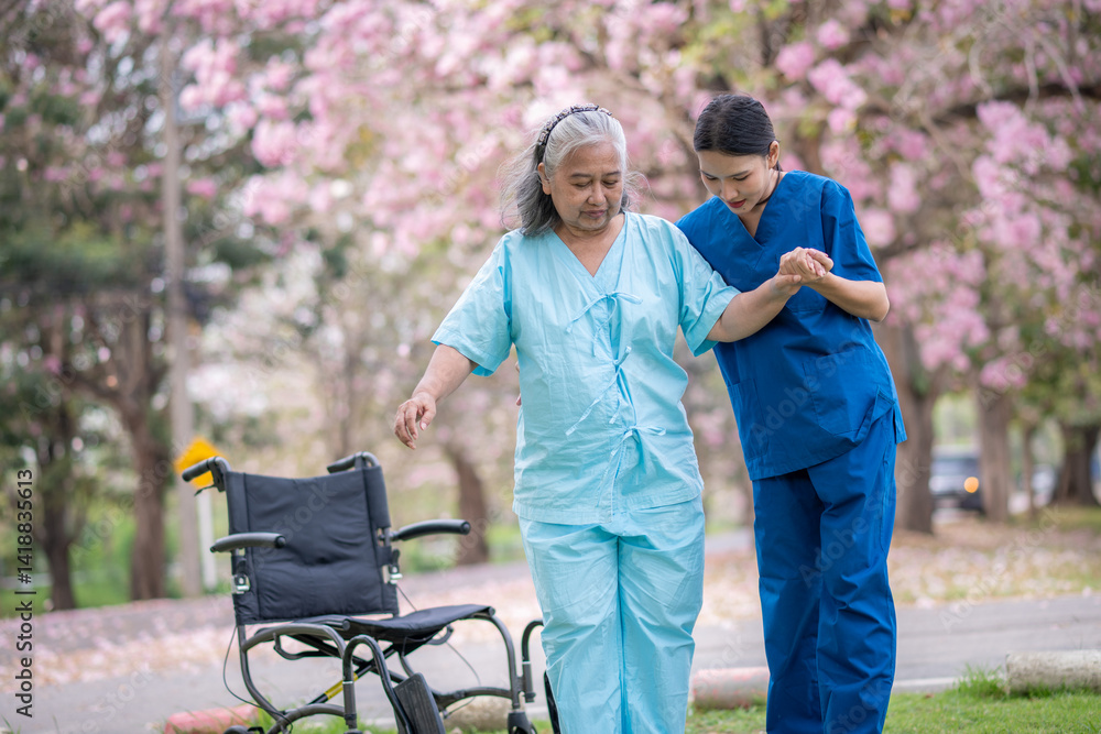 Nurse caregiver with elderly woman enjoying beneath blooming trees. suggesting in healthcare setting wheelchair with gentle support from her caregiver and elder healthy concept.