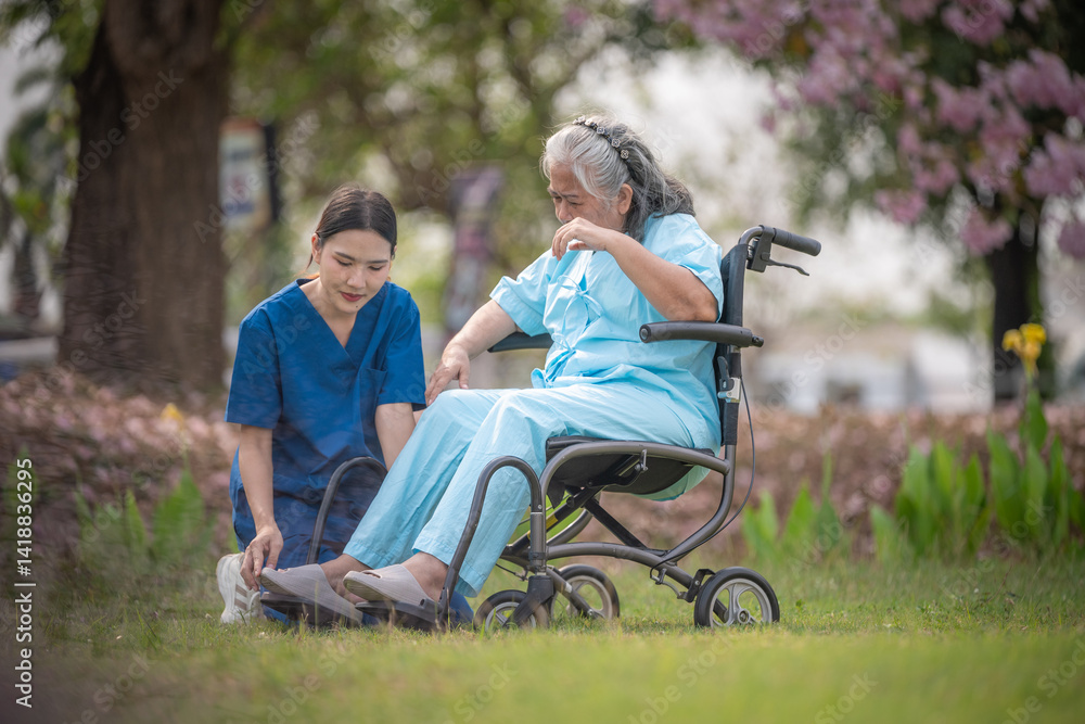 Nurse caregiver with elderly woman enjoying beneath blooming trees. suggesting in healthcare setting wheelchair with gentle support from her caregiver and elder healthy concept.