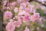 Beautifully cluster of delicate pink blossoms in full bloom. These soft, ruffled flowers hang gracefully from thin, brown branches, exuding an air of gentle elegance and tranquility.