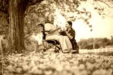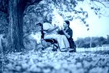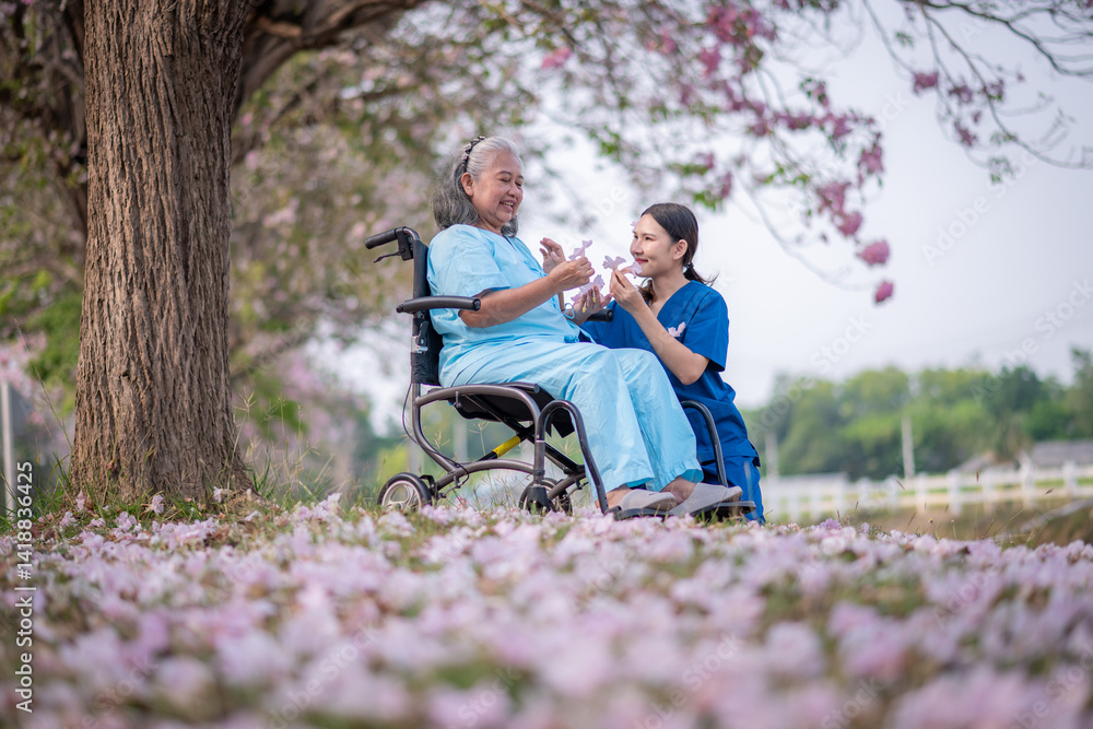 Nurse caregiver with elderly woman enjoying beneath blooming trees. suggesting in healthcare setting wheelchair with gentle support from her caregiver and elder healthy concept.