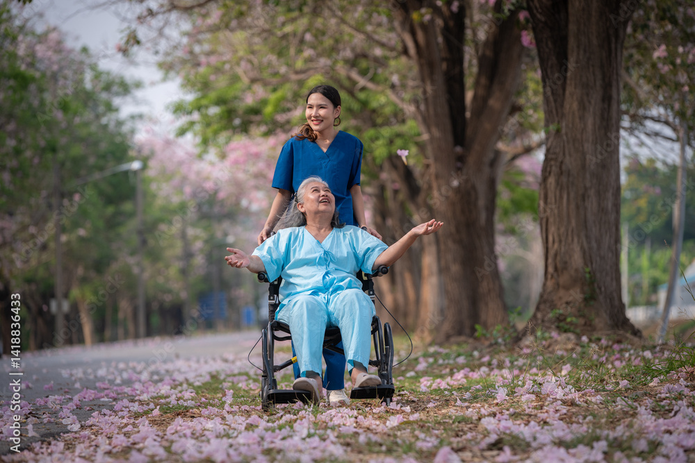 Nurse caregiver with elderly woman enjoying beneath blooming trees. suggesting in healthcare setting wheelchair with gentle support from her caregiver and elder healthy concept.