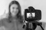 woman with camera recording video at home