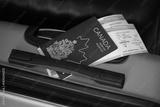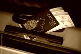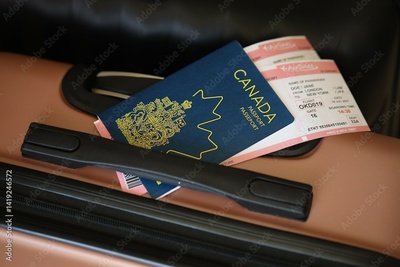 Canadian passport with tickets lies on touristic suitcase in airport hall