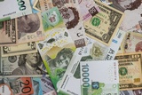 Big amount of money bills of different currencies and countries. Assortment background of international cash in big pile close up