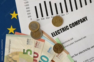 European union Euro money bills and coins with european electricity utility bill on table