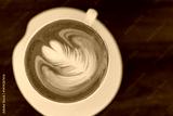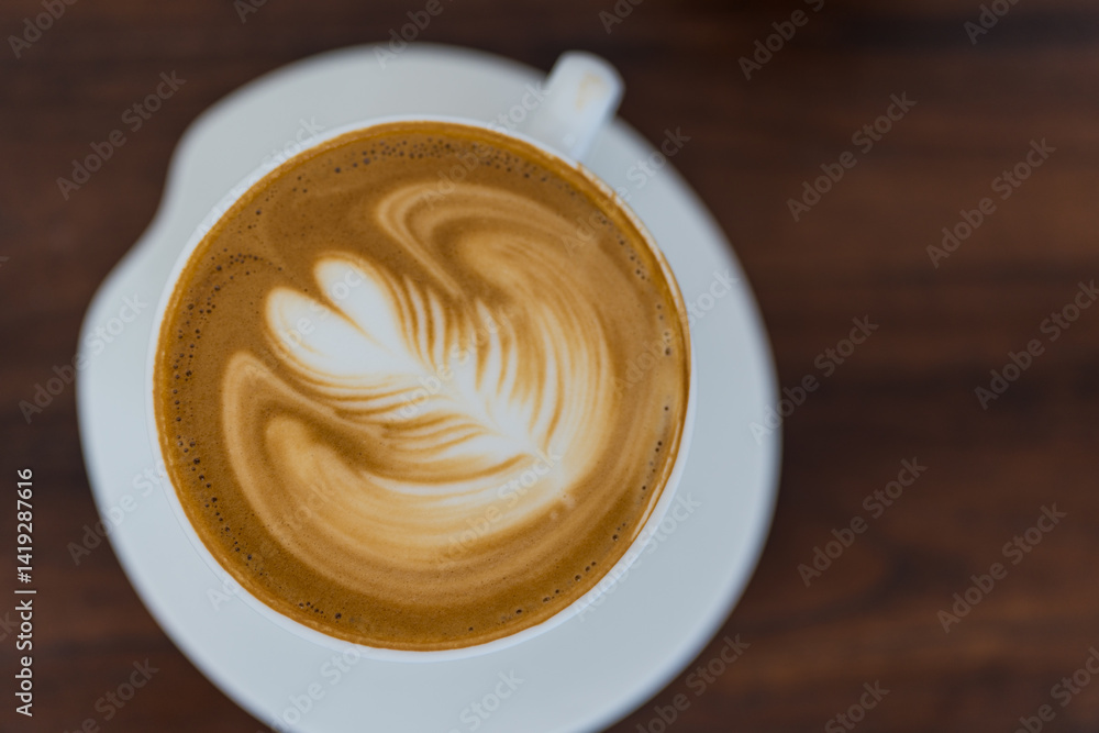 Close up of professional latte art showing milk foam latte art with leaf details on hot coffee cup