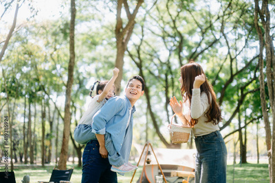 Happy parents and daughter Bakery and Bread Fruit enjoy in a sunny garden. A joyful summer picnic full of love, food for family