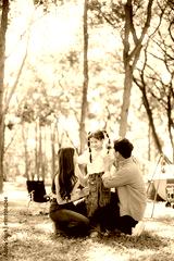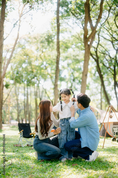 Happy parents and daughter Bakery and Bread Fruit enjoy in a sunny garden. A joyful summer picnic full of love, food for family