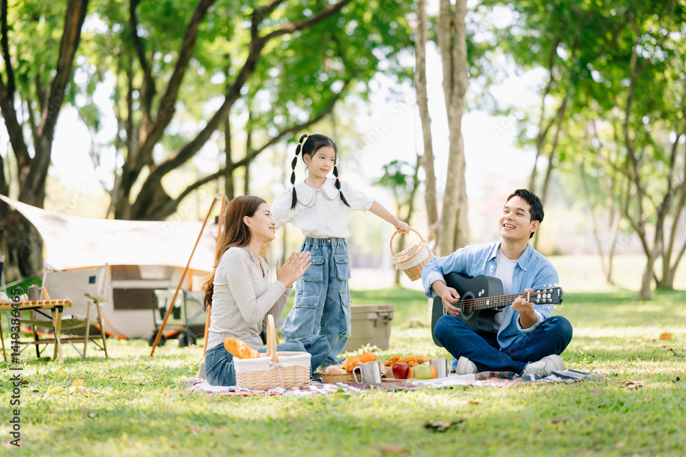 Happy parents and daughter Bakery and Bread Fruit enjoy in a sunny garden. A joyful summer picnic full of love, food for family, outdoor
