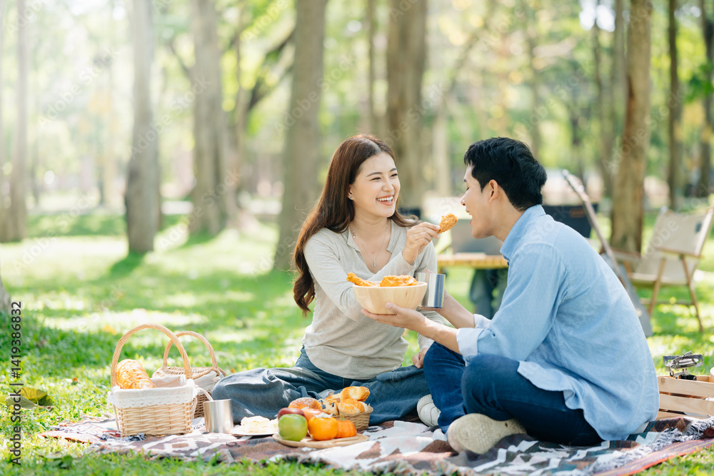 Asian couple enjoys a peaceful camping morning with coffee, breakfast, music, and devices in nature