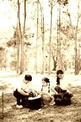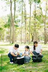 Asian parents and child collect trash in the forest, promoting recycling, unity, and ecology. A heartwarming scene of love, care, teamwork