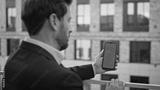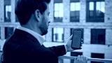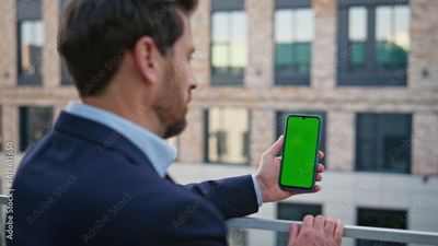 Man watching mockup smartphone screen outdoors closeup. Director holding phone