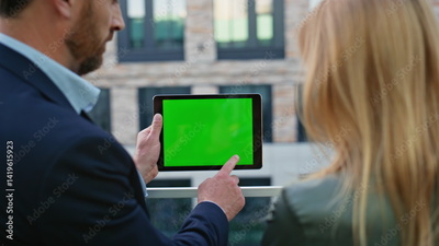 Business couple looking greenscreen tablet standing at urban district closeup