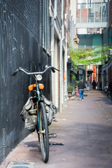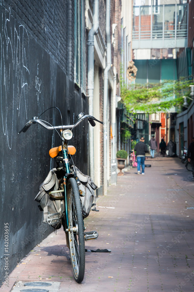Front view of a classic urban bicycle with orange saddle and bags on the trunk, parked on a narrow street with walking people in the background, on a sunny spring day in Amsterdam, Netherlands