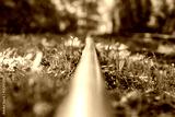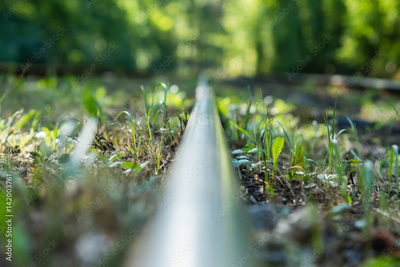Rail of old railway leading through green grass on a sunny summer day in a forest