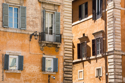 Old yellow facades of Italian houses with open wooden windows in the historical center of Rome