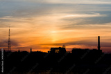Dramatic sunset over the city silhouette near water
