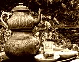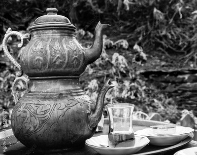 Two vintage Turkish teapots with double stacked kettles allowing tea to be brewed, with one glass cup filled with tea, served outdoors. Tea tradition in Turkey, Middle East. Toned in black and white
