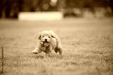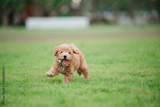 Playful puppy running in green park cute animal photography outdoor joy close-up view