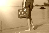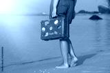 Beautiful girl with a old vintage suitcase in a beach