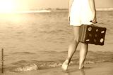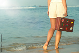 Beautiful girl with a old vintage suitcase in a beach
