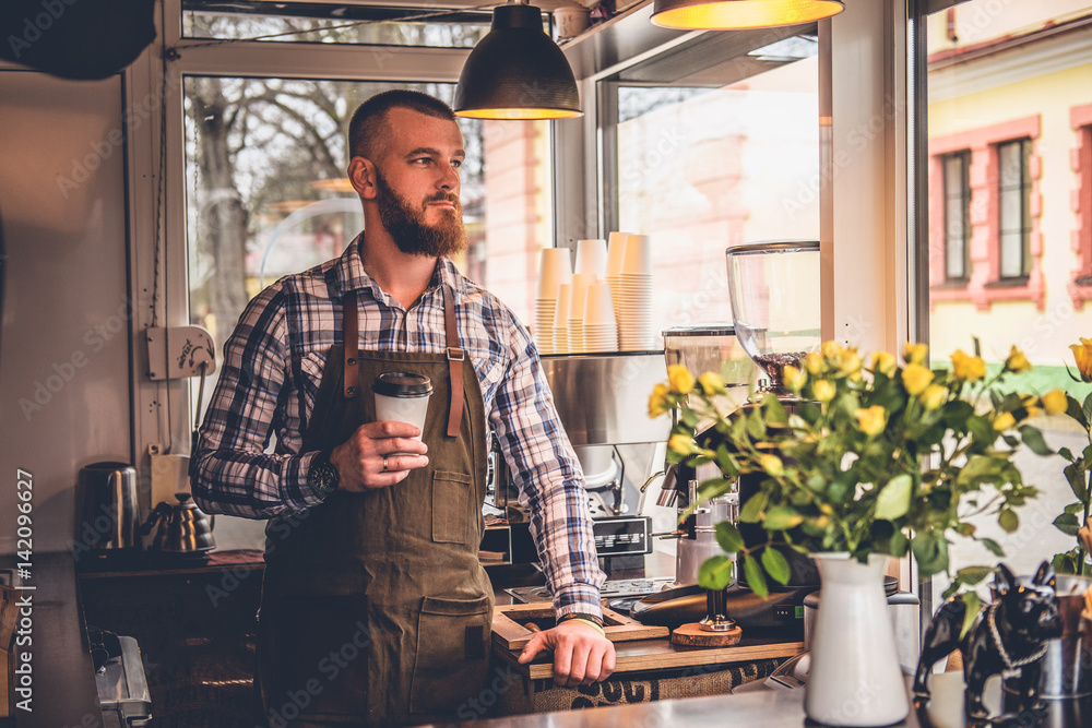 Redheads craft coffee seller in a small street cafe.