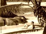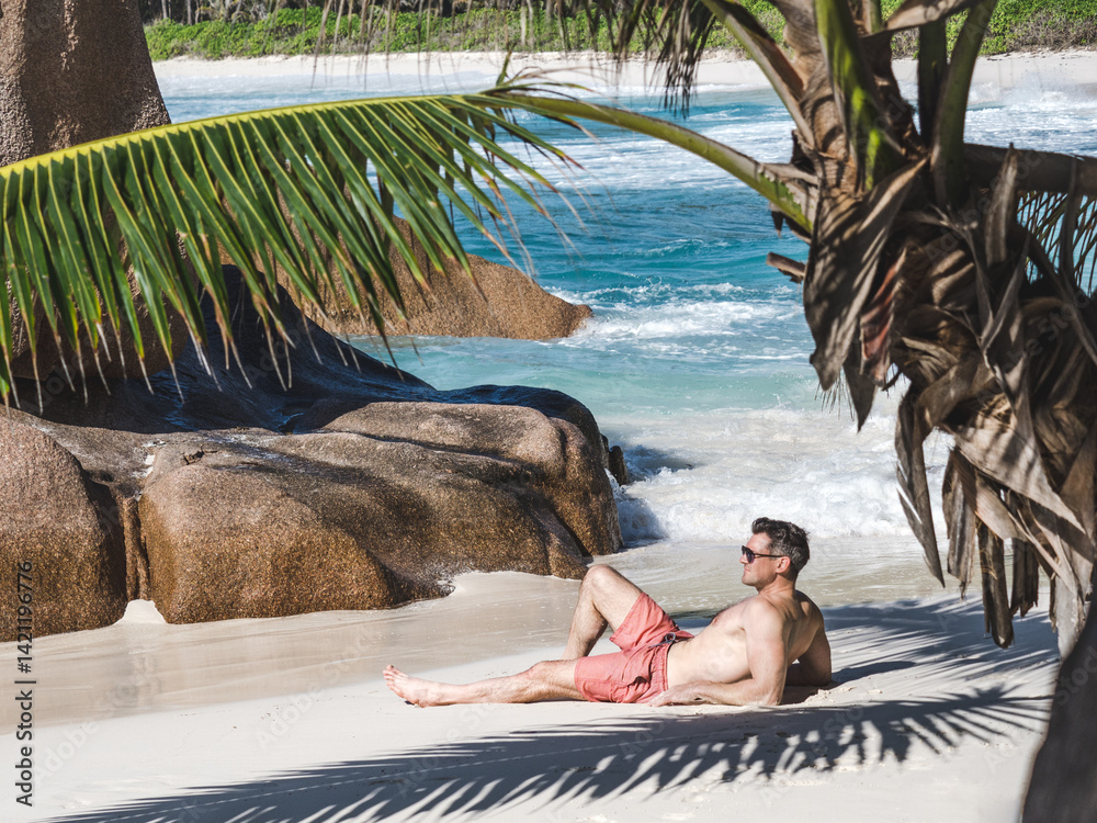 Handsome man and stunning white sand beach with palm trees and rocks in the background. Beautiful views and sights of Seychelles. Clear, warm sunlight. Outdoor. Concept of leisure and travel