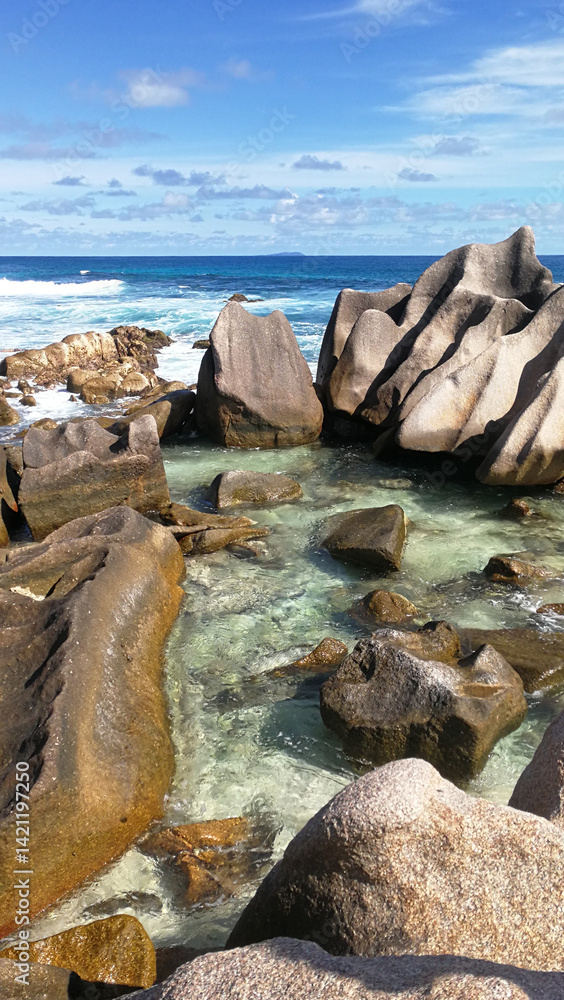 Stunning views of empty beaches of the wonderful islands of Seychelles. Beautiful landmark. Clear, sunny day, warm sunlight. No people, outdoors. Concept of leisure and travel