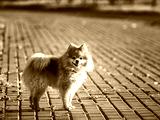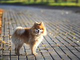 Cute puppy on a morning walk. Clear, sunny day. Close-up, outdoors. Day light. Concept of care and training pets